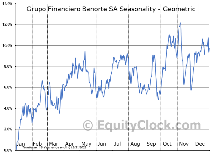 Analysis of the Grupo Financiero Banorte SA (OTCMKT:GBOOY) seasonal charts above shows that a Buy Date of November 30 and a Sell Date of April 6 has resulted in a geometric average return of 6.36% above the benchmark rate of the S&P 500 Total Return Index over the past 16 years. This seasonal timeframe has shown positive results compared to the benchmark in 14 of those periods. This is a very good rate of success and the return strongly outperforms the relative buy-and-hold performance of the stock over the past 16 years by an average of 10.08% per year.