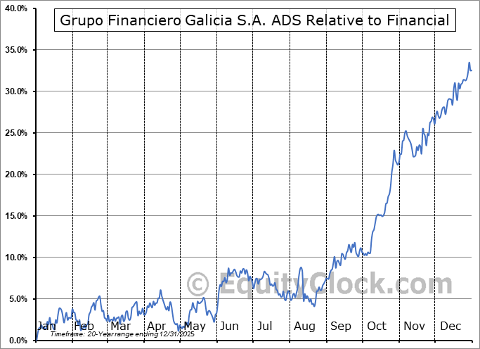 Analysis of the Grupo Financiero Galicia S.A. ADS (NASD:GGAL) seasonal charts above shows that a Buy Date of October 7 and a Sell Date of December 29 has resulted in a geometric average return of 12.25% above the benchmark rate of the S&P 500 Total Return Index over the past 20 years. This seasonal timeframe has shown positive results compared to the benchmark in 15 of those periods. This is a good rate of success and the return strongly outperforms the relative buy-and-hold performance of the stock over the past 20 years by an average of 10.85% per year.