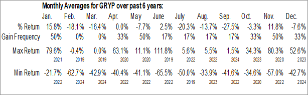 A word of caution: Only 6 years of data is available for shares of GRYP, perhaps insufficient to create a seasonal profile that accurately gauges the seasonal tendencies influencing the investment. Ideally, while 20 years is preferred, at least 10 years of data is required to perform a seasonal analysis that is considered to be reliable for future seasonal periods.