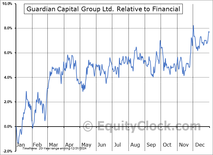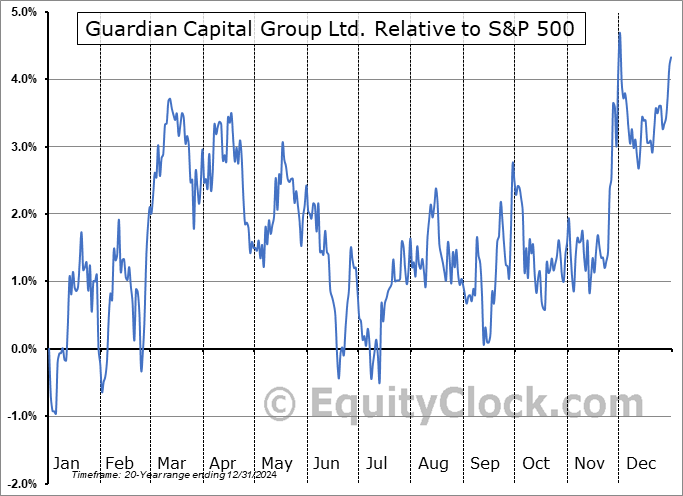 Analysis of the Guardian Capital Group Ltd. (TSE:GCG/A.TO) seasonal charts above shows that a Buy Date of December 10 and a Sell Date of March 19 has resulted in a geometric average return of 3.37% above the benchmark rate of the S&P 500 Total Return Index over the past 20 years. This seasonal timeframe has shown positive results compared to the benchmark in 16 of those periods. This is a very good rate of success and the return strongly outperforms the relative buy-and-hold performance of the stock over the past 20 years by an average of 3.45% per year.