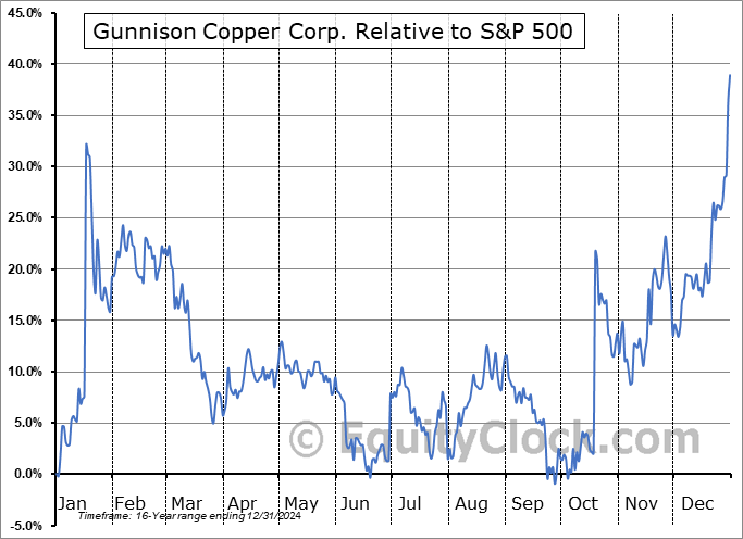 Analysis of the Gunnison Copper Corp. (TSE:GCU.TO) seasonal charts above shows that a Buy Date of December 3 and a Sell Date of March 4 has resulted in a geometric average return of 22.1% above the benchmark rate of the S&P 500 Total Return Index over the past 16 years. This seasonal timeframe has shown positive results compared to the benchmark in 12 of those periods. This is a good rate of success and the return strongly outperforms the relative buy-and-hold performance of the stock over the past 16 years by an average of 26.86% per year.