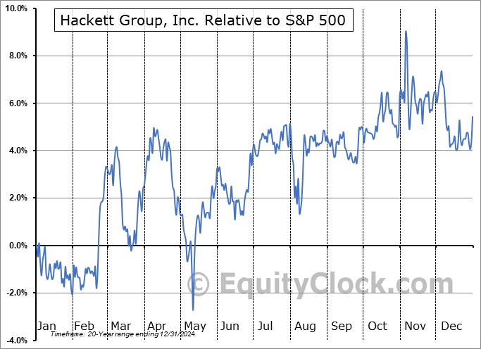 Analysis of the Hackett Group, Inc. (NASD:HCKT) seasonal charts above shows that a Buy Date of August 14 and a Sell Date of November 5 has resulted in a geometric average return of 3.42% above the benchmark rate of the S&P 500 Total Return Index over the past 20 years. This seasonal timeframe has shown positive results compared to the benchmark in 17 of those periods. This is a very good rate of success and the return strongly outperforms the relative buy-and-hold performance of the stock over the past 20 years by an average of 2.67% per year.