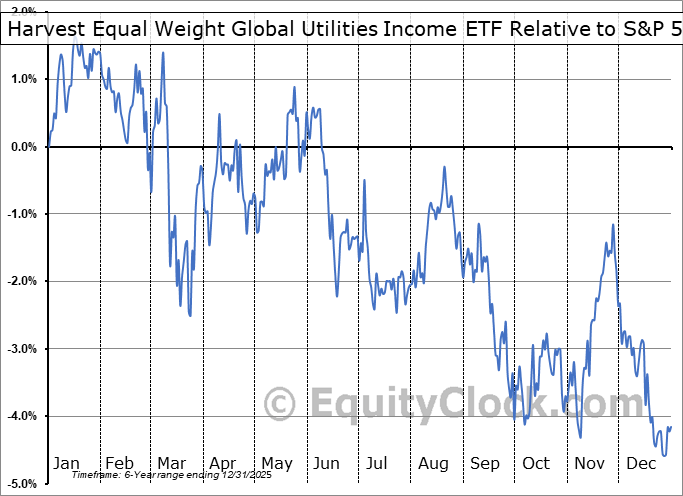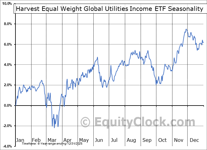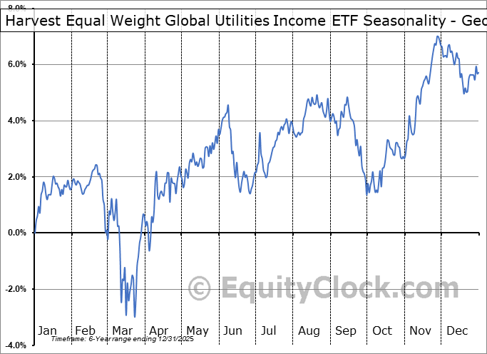 Analysis of the Harvest Equal Weight Global Utilities Income ETF (TSE:HUTL.TO) seasonal charts above shows that a Buy Date of February 9 and a Sell Date of May 12 has resulted in a geometric average return of 4.3% above the benchmark rate of the S&P 500 Total Return Index over the past 5 years. This seasonal timeframe has shown positive results compared to the benchmark in 4 of those periods. This is a very good rate of success and the return strongly outperforms the relative buy-and-hold performance of the stock over the past 5 years by an average of 13.4% per year.