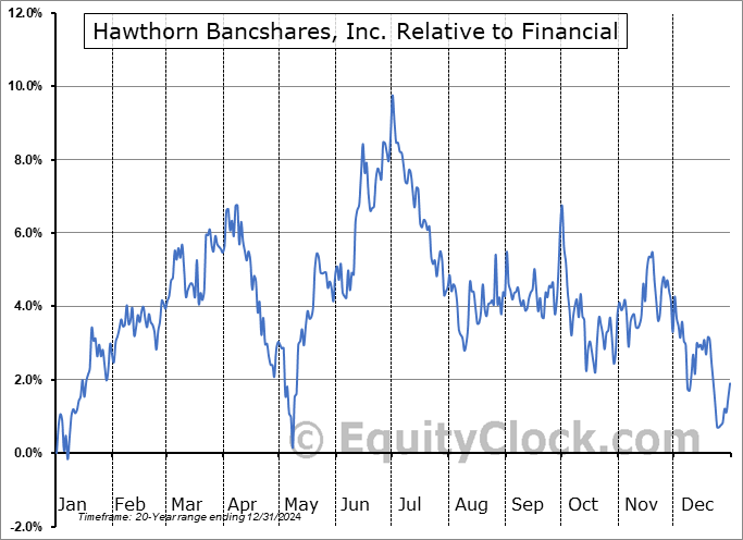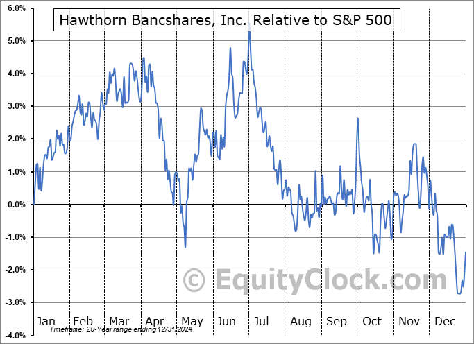 Analysis of the Hawthorn Bancshares, Inc. (NASD:HWBK) seasonal charts above shows that a Buy Date of December 26 and a Sell Date of March 25 has resulted in a geometric average return of 3.02% above the benchmark rate of the S&P 500 Total Return Index over the past 20 years. This seasonal timeframe has shown positive results compared to the benchmark in 14 of those periods. This is a good rate of success and the return strongly outperforms the relative buy-and-hold performance of the stock over the past 20 years by an average of 7.7% per year.