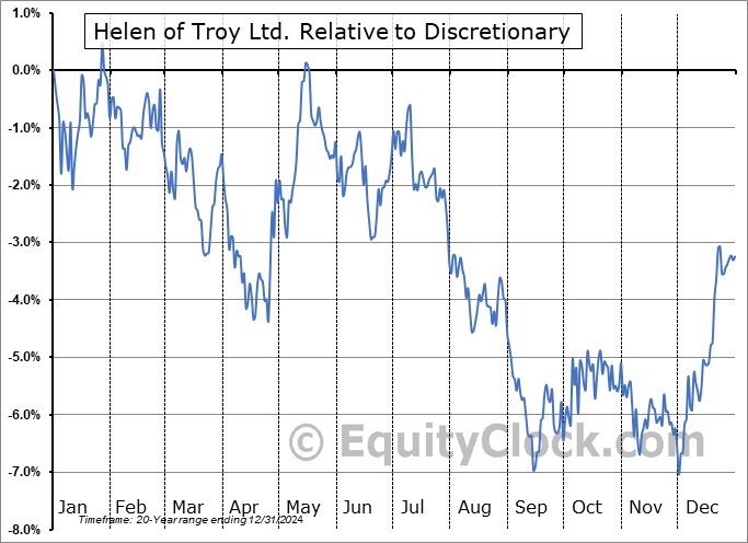 Analysis of the Helen of Troy Ltd. (NASD:HELE) seasonal charts above shows that a Buy Date of November 9 and a Sell Date of February 27 has resulted in a geometric average return of 4.33% above the benchmark rate of the S&P 500 Total Return Index over the past 20 years. This seasonal timeframe has shown positive results compared to the benchmark in 15 of those periods. This is a good rate of success and the return strongly outperforms the relative buy-and-hold performance of the stock over the past 20 years by an average of 11.1% per year.