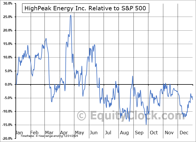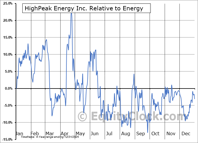 Analysis of the HighPeak Energy Inc. (NASD:HPK) seasonal charts above shows that a Buy Date of December 5 and a Sell Date of March 1 has resulted in a geometric average return of 51.22% above the benchmark rate of the S&P 500 Total Return Index over the past 4 years. This seasonal timeframe has shown positive results compared to the benchmark in 4 of those periods. This is an excellent rate of success and the return strongly outperforms the relative buy-and-hold performance of the stock over the past 4 years by an average of 64.22% per year.