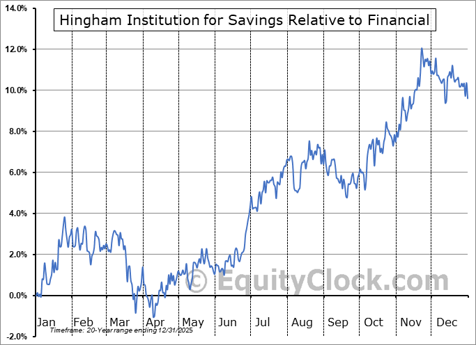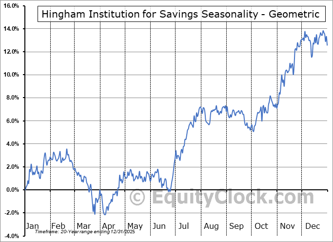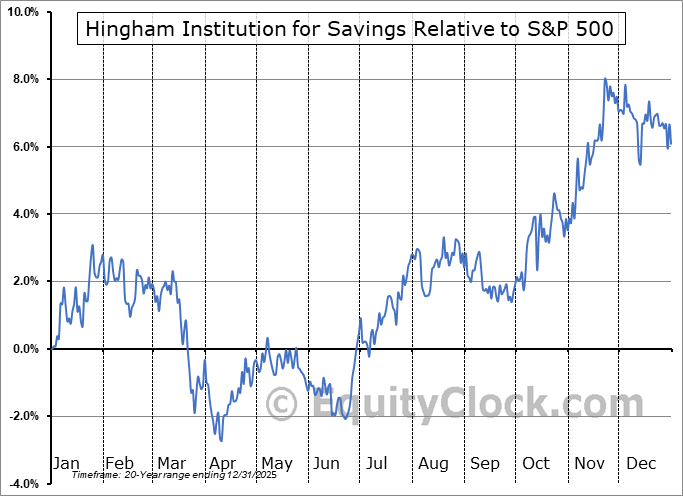Analysis of the Hingham Institution for Savings (NASD:HIFS) seasonal charts above shows that a Buy Date of November 8 and a Sell Date of January 31 has resulted in a geometric average return of 4.81% above the benchmark rate of the S&P 500 Total Return Index over the past 20 years. This seasonal timeframe has shown positive results compared to the benchmark in 17 of those periods. This is a very good rate of success and the return strongly outperforms the relative buy-and-hold performance of the stock over the past 20 years by an average of 3.8% per year.