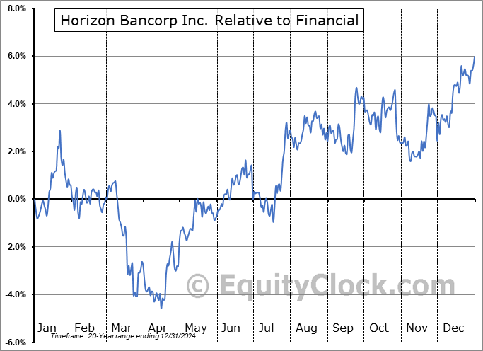 Analysis of the Horizon Bancorp Inc. (NASD:HBNC) seasonal charts above shows that a Buy Date of July 12 and a Sell Date of October 21 has resulted in a geometric average return of 4.93% above the benchmark rate of the S&P 500 Total Return Index over the past 20 years. This seasonal timeframe has shown positive results compared to the benchmark in 16 of those periods. This is a very good rate of success and the return strongly outperforms the relative buy-and-hold performance of the stock over the past 20 years by an average of 6.95% per year.