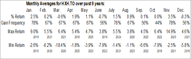 A word of caution: Only 8 years of data is available for shares of HXH.TO, perhaps insufficient to create a seasonal profile that accurately gauges the seasonal tendencies influencing the investment. Ideally, while 20 years is preferred, at least 10 years of data is required to perform a seasonal analysis that is considered to be reliable for future seasonal periods.