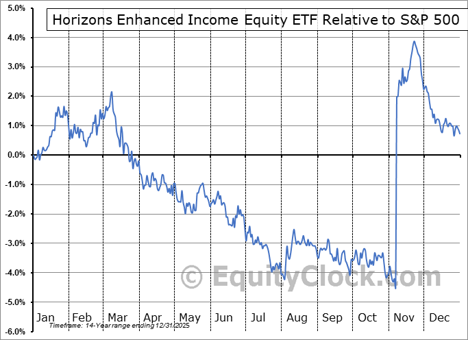 Analysis of the Horizons Enhanced Income Equity ETF (TSE:HEX.TO) seasonal charts above shows that a Buy Date of August 3 and a Sell Date of October 24 has resulted in a geometric average return of 0.41% above the benchmark rate of the S&P 500 Total Return Index over the past 13 years. This seasonal timeframe has shown positive results compared to the benchmark in 9 of those periods. This is a good rate of success and the return strongly outperforms the relative buy-and-hold performance of the stock over the past 13 years by an average of 5.06% per year.
