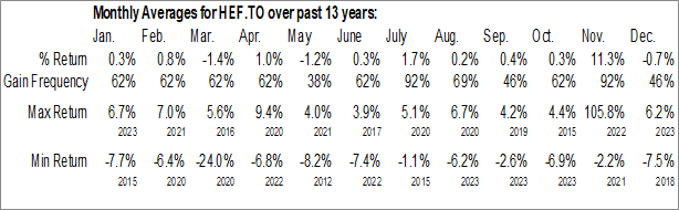 To download HEF.TO seasonal chart data, please log in or Subscribe.
