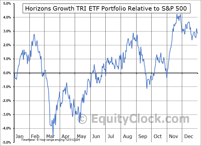 Analysis of the Horizons Growth TRI ETF Portfolio (TSE:HGRO.TO) seasonal charts above shows that a Buy Date of December 28 and a Sell Date of March 19 has resulted in a geometric average return of 0.74% above the benchmark rate of the S&P 500 Total Return Index over the past 5 years. This seasonal timeframe has shown positive results compared to the benchmark in 4 of those periods. This is a very good rate of success and the return strongly outperforms the relative buy-and-hold performance of the stock over the past 5 years by an average of 3.5% per year.