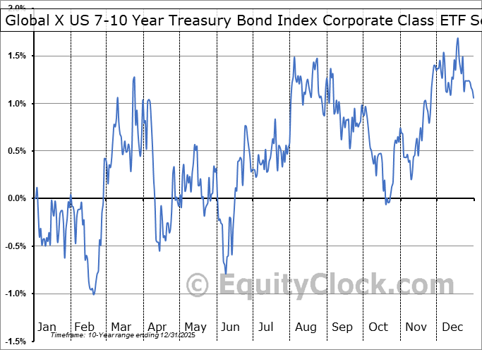 Analysis of the Global X US 7-10 Year Treasury Bond Index Corporate Class ETF (TSE:HTB.TO) seasonal charts above shows that a Buy Date of February 16 and a Sell Date of May 15 has resulted in a geometric average return of 1.49% above the benchmark rate of the S&P 500 Total Return Index over the past 9 years. This seasonal timeframe has shown positive results compared to the benchmark in 6 of those periods. This is a good rate of success and the return strongly outperforms the relative buy-and-hold performance of the stock over the past 9 years by an average of 13.44% per year.