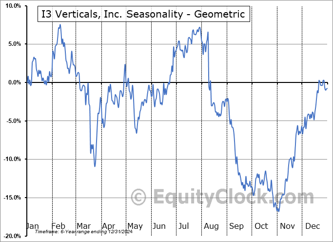Analysis of the I3 Verticals, Inc. (NASD:IIIV) seasonal charts above shows that a Buy Date of November 8 and a Sell Date of February 27 has resulted in a geometric average return of 20.63% above the benchmark rate of the S&P 500 Total Return Index over the past 6 years. This seasonal timeframe has shown positive results compared to the benchmark in 6 of those periods. This is an excellent rate of success and the return strongly outperforms the relative buy-and-hold performance of the stock over the past 6 years by an average of 35.28% per year.