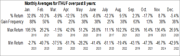A word of caution: Only 8 years of data is available for shares of ITHUF, perhaps insufficient to create a seasonal profile that accurately gauges the seasonal tendencies influencing the investment. Ideally, while 20 years is preferred, at least 10 years of data is required to perform a seasonal analysis that is considered to be reliable for future seasonal periods.