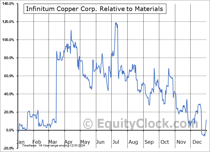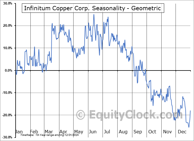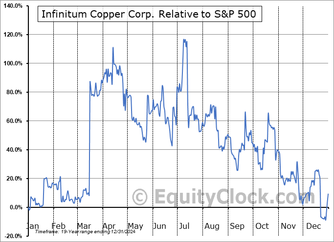 Analysis of the Infinitum Copper Corp. (TSXV:INFI.V) seasonal charts above shows that a Buy Date of December 26 and a Sell Date of March 22 has resulted in a geometric average return of 30% above the benchmark rate of the S&P 500 Total Return Index over the past 19 years. This seasonal timeframe has shown positive results compared to the benchmark in 15 of those periods. This is a good rate of success and the return strongly outperforms the relative buy-and-hold performance of the stock over the past 19 years by an average of 55.74% per year.