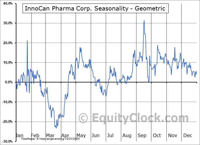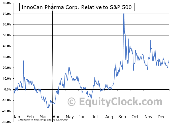 Analysis of the InnoCan Pharma Corp. (CSE:INNO.CA) seasonal charts above shows that a Buy Date of January 27 and a Sell Date of May 9 has resulted in a geometric average return of 23.38% above the benchmark rate of the S&P 500 Total Return Index over the past 5 years. This seasonal timeframe has shown positive results compared to the benchmark in 4 of those periods. This is a very good rate of success and the return strongly outperforms the relative buy-and-hold performance of the stock over the past 5 years by an average of 27.9% per year.