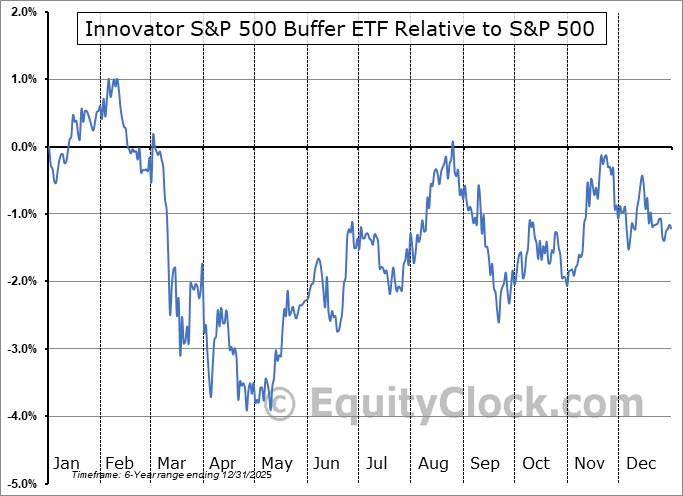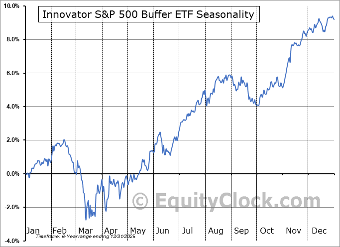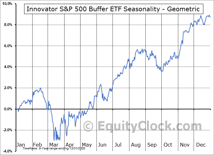 Analysis of the Innovator S&P 500 Buffer ETF (AMEX:BJUN) seasonal charts above shows that a Buy Date of December 15 and a Sell Date of March 13 has resulted in a geometric average return of 1.32% above the benchmark rate of the S&P 500 Total Return Index over the past 6 years. This seasonal timeframe has shown positive results compared to the benchmark in 4 of those periods. This is a good rate of success and the return strongly outperforms the relative buy-and-hold performance of the stock over the past 6 years by an average of 6.78% per year.