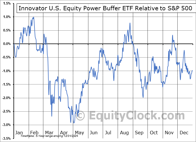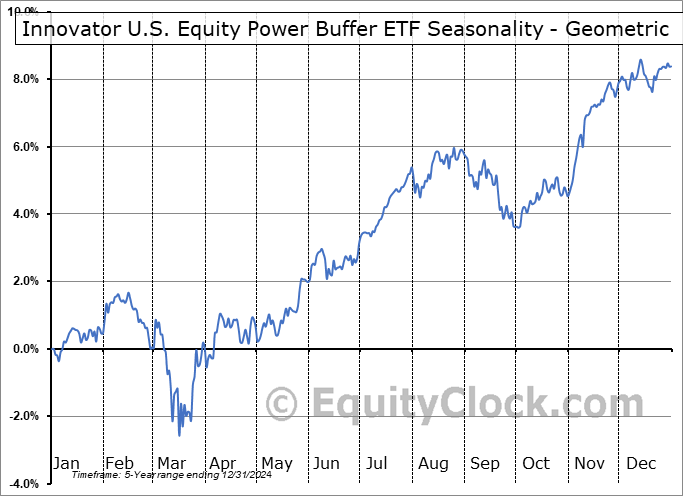 Analysis of the Innovator U.S. Equity Power Buffer ETF (AMEX:PAUG) seasonal charts above shows that a Buy Date of July 10 and a Sell Date of September 30 has resulted in a geometric average return of 0.68% above the benchmark rate of the S&P 500 Total Return Index over the past 5 years. This seasonal timeframe has shown positive results compared to the benchmark in 4 of those periods. This is a very good rate of success and the return strongly outperforms the relative buy-and-hold performance of the stock over the past 5 years by an average of 6.01% per year.