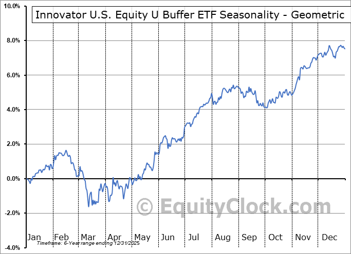 Analysis of the Innovator U.S. Equity U Buffer ETF (AMEX:UAUG) seasonal charts above shows that a Buy Date of July 10 and a Sell Date of September 30 has resulted in a geometric average return of 0.74% above the benchmark rate of the S&P 500 Total Return Index over the past 5 years. This seasonal timeframe has shown positive results compared to the benchmark in 4 of those periods. This is a very good rate of success and the return strongly outperforms the relative buy-and-hold performance of the stock over the past 5 years by an average of 7.6% per year.