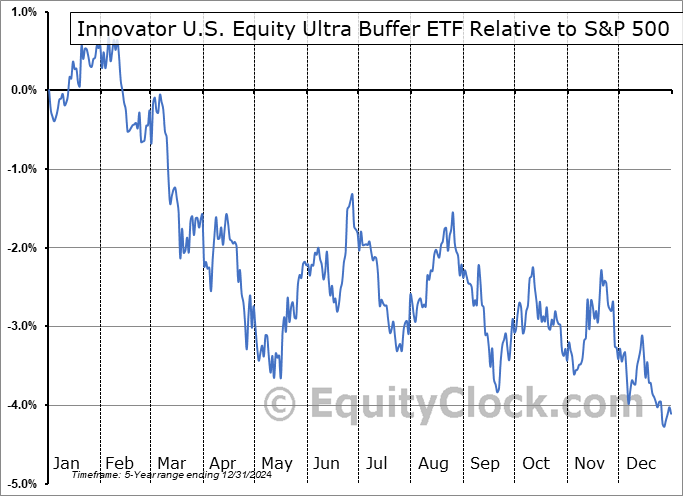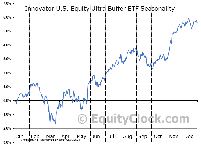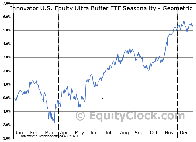 Analysis of the Innovator U.S. Equity Ultra Buffer ETF (AMEX:UJUN) seasonal charts above shows that a Buy Date of July 15 and a Sell Date of October 3 has resulted in a geometric average return of 0.62% above the benchmark rate of the S&P 500 Total Return Index over the past 5 years. This seasonal timeframe has shown positive results compared to the benchmark in 4 of those periods. This is a very good rate of success and the return strongly outperforms the relative buy-and-hold performance of the stock over the past 5 years by an average of 8.61% per year.