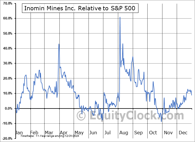 Analysis of the Inomin Mines Inc. (TSXV:MINE.V) seasonal charts above shows that a Buy Date of January 2 and a Sell Date of April 6 has resulted in a geometric average return of 20.09% above the benchmark rate of the S&P 500 Total Return Index over the past 10 years. This seasonal timeframe has shown positive results compared to the benchmark in 8 of those periods. This is a very good rate of success and the return strongly outperforms the relative buy-and-hold performance of the stock over the past 10 years by an average of 33.95% per year.