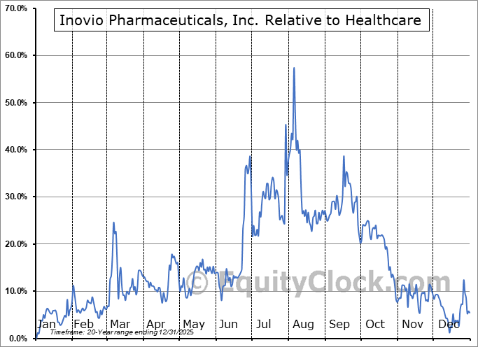 Analysis of the Inovio Pharmaceuticals, Inc. (NASD:INO) seasonal charts above shows that a Buy Date of December 6 and a Sell Date of March 4 has resulted in a geometric average return of 10.57% above the benchmark rate of the S&P 500 Total Return Index over the past 20 years. This seasonal timeframe has shown positive results compared to the benchmark in 13 of those periods. This is a good rate of success and the return strongly outperforms the relative buy-and-hold performance of the stock over the past 20 years by an average of 38.33% per year.