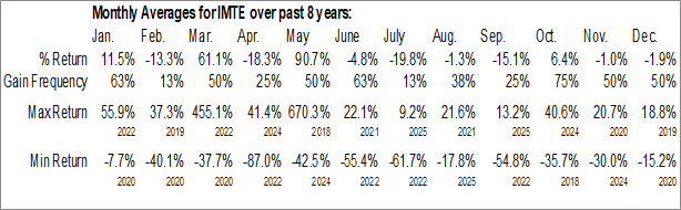 A word of caution: Only 7 years of data is available for shares of IMTE, perhaps insufficient to create a seasonal profile that accurately gauges the seasonal tendencies influencing the investment. Ideally, while 20 years is preferred, at least 10 years of data is required to perform a seasonal analysis that is considered to be reliable for future seasonal periods.