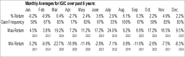 A word of caution: Only 6 years of data is available for shares of IGIC, perhaps insufficient to create a seasonal profile that accurately gauges the seasonal tendencies influencing the investment. Ideally, while 20 years is preferred, at least 10 years of data is required to perform a seasonal analysis that is considered to be reliable for future seasonal periods.