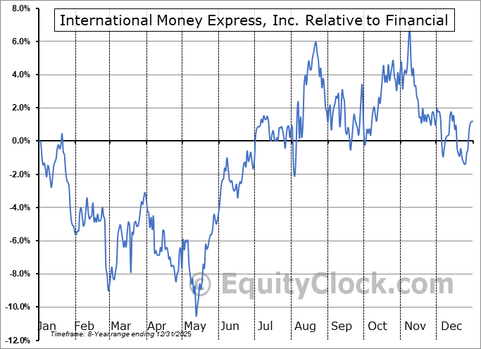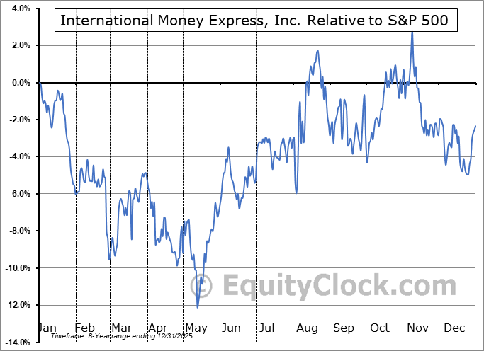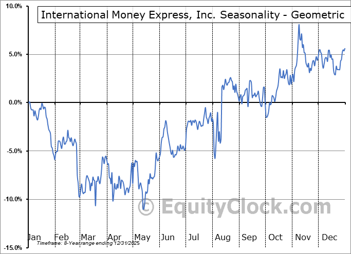Analysis of the International Money Express, Inc. (NASD:IMXI) seasonal charts above shows that a Buy Date of May 13 and a Sell Date of August 1 has resulted in a geometric average return of 8.09% above the benchmark rate of the S&P 500 Total Return Index over the past 7 years. This seasonal timeframe has shown positive results compared to the benchmark in 5 of those periods. This is a good rate of success and the return strongly outperforms the relative buy-and-hold performance of the stock over the past 7 years by an average of 10.18% per year.