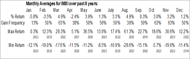 A word of caution: Only 7 years of data is available for shares of IMXI, perhaps insufficient to create a seasonal profile that accurately gauges the seasonal tendencies influencing the investment. Ideally, while 20 years is preferred, at least 10 years of data is required to perform a seasonal analysis that is considered to be reliable for future seasonal periods.