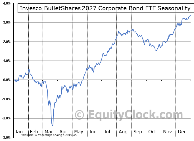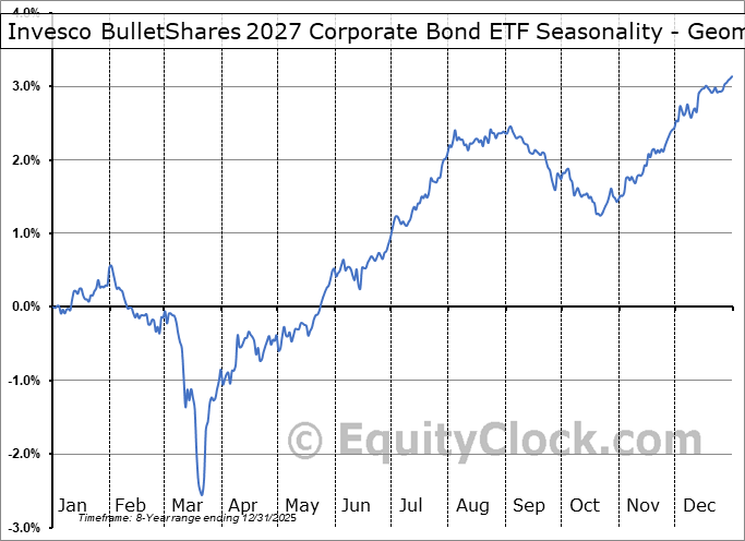 Analysis of the Invesco BulletShares 2027 Corporate Bond ETF (NASD:BSCR) seasonal charts above shows that a Buy Date of July 10 and a Sell Date of October 3 has resulted in a geometric average return of 0.55% above the benchmark rate of the S&P 500 Total Return Index over the past 7 years. This seasonal timeframe has shown positive results compared to the benchmark in 5 of those periods. This is a good rate of success and the return strongly outperforms the relative buy-and-hold performance of the stock over the past 7 years by an average of 10.01% per year.