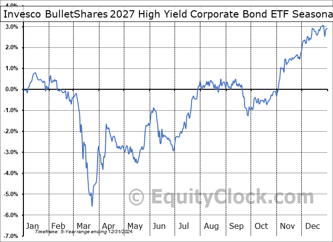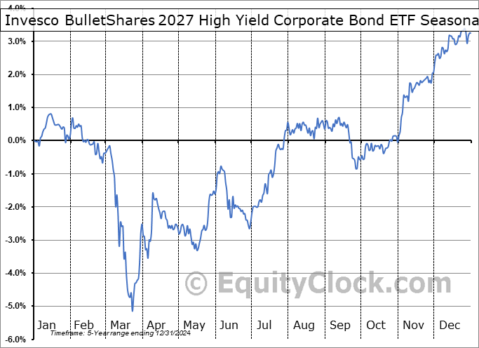 Analysis of the Invesco BulletShares 2027 High Yield Corporate Bond ETF (NASD:BSJR) seasonal charts above shows that a Buy Date of July 14 and a Sell Date of October 3 has resulted in a geometric average return of 1.42% above the benchmark rate of the S&P 500 Total Return Index over the past 5 years. This seasonal timeframe has shown positive results compared to the benchmark in 5 of those periods. This is an excellent rate of success and the return strongly outperforms the relative buy-and-hold performance of the stock over the past 5 years by an average of 11.5% per year.