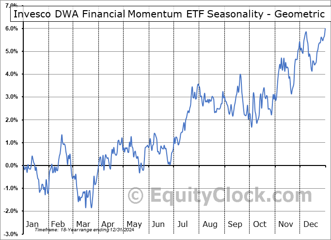 Analysis of the Invesco DWA Financial Momentum ETF (NASD:PFI) seasonal charts above shows that a Buy Date of September 6 and a Sell Date of December 5 has resulted in a geometric average return of 0.43% above the benchmark rate of the S&P 500 Total Return Index over the past 18 years. This seasonal timeframe has shown positive results compared to the benchmark in 13 of those periods. This is a good rate of success and the return strongly outperforms the relative buy-and-hold performance of the stock over the past 18 years by an average of 4.31% per year.