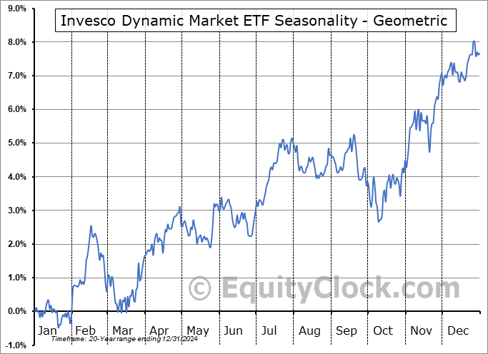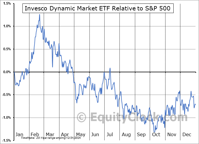 Analysis of the Invesco Dynamic Market ETF (NYSE:BMVP) seasonal charts above shows that a Buy Date of October 9 and a Sell Date of February 21 has resulted in a geometric average return of 1.69% above the benchmark rate of the S&P 500 Total Return Index over the past 20 years. This seasonal timeframe has shown positive results compared to the benchmark in 16 of those periods. This is a very good rate of success and the return strongly outperforms the relative buy-and-hold performance of the stock over the past 20 years by an average of 4% per year.