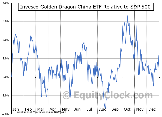 Analysis of the Invesco Golden Dragon China ETF (NASD:PGJ) seasonal charts above shows that a Buy Date of October 28 and a Sell Date of January 19 has resulted in a geometric average return of 1.91% above the benchmark rate of the S&P 500 Total Return Index over the past 20 years. This seasonal timeframe has shown positive results compared to the benchmark in 12 of those periods. This is a fair rate of success and the return strongly outperforms the relative buy-and-hold performance of the stock over the past 20 years by an average of 7.15% per year.