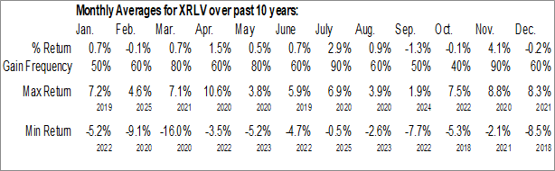 A word of caution: Only 9 years of data is available for shares of XRLV, perhaps insufficient to create a seasonal profile that accurately gauges the seasonal tendencies influencing the investment. Ideally, while 20 years is preferred, at least 10 years of data is required to perform a seasonal analysis that is considered to be reliable for future seasonal periods.
