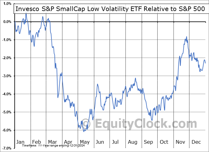 Analysis of the Invesco S&P SmallCap Low Volatility ETF (AMEX:XSLV) seasonal charts above shows that a Buy Date of July 14 and a Sell Date of November 14 has resulted in a geometric average return of 1.81% above the benchmark rate of the S&P 500 Total Return Index over the past 11 years. This seasonal timeframe has shown positive results compared to the benchmark in 10 of those periods. This is an excellent rate of success and the return strongly outperforms the relative buy-and-hold performance of the stock over the past 11 years by an average of 7.75% per year.