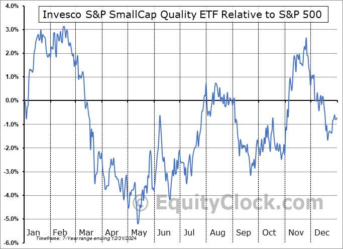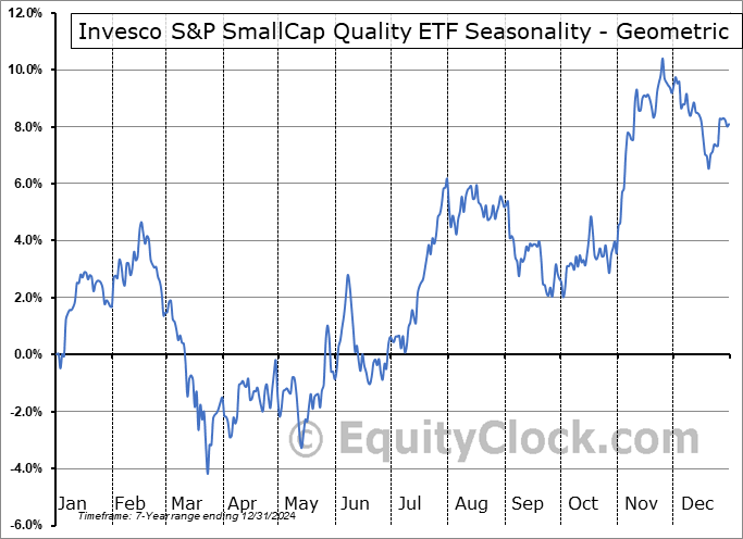 Analysis of the Invesco S&P SmallCap Quality ETF (AMEX:XSHQ) seasonal charts above shows that a Buy Date of June 25 and a Sell Date of November 14 has resulted in a geometric average return of 2.69% above the benchmark rate of the S&P 500 Total Return Index over the past 7 years. This seasonal timeframe has shown positive results compared to the benchmark in 6 of those periods. This is a very good rate of success and the return strongly outperforms the relative buy-and-hold performance of the stock over the past 7 years by an average of 7.57% per year.
