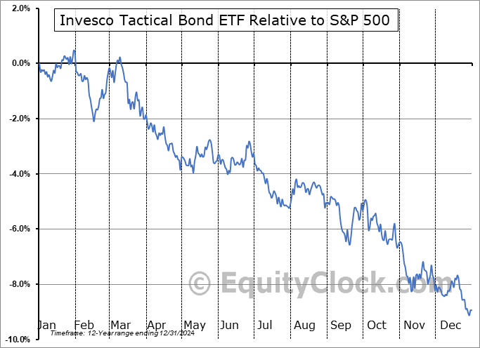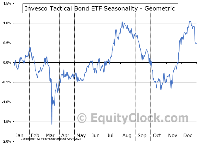 Analysis of the Invesco Tactical Bond ETF (TSE:PTB.TO) seasonal charts above shows that a Buy Date of July 15 and a Sell Date of October 3 has resulted in a geometric average return of 0.02% above the benchmark rate of the S&P 500 Total Return Index over the past 12 years. This seasonal timeframe has shown positive results compared to the benchmark in 7 of those periods. This is a fair rate of success and the return strongly outperforms the relative buy-and-hold performance of the stock over the past 12 years by an average of 12.07% per year.