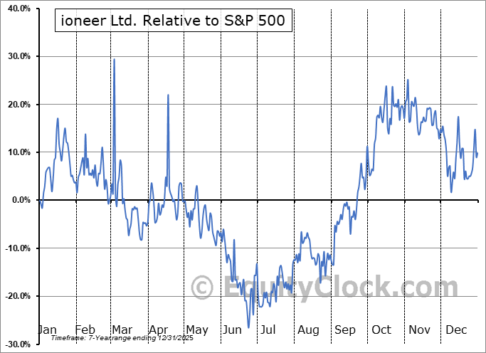 Analysis of the ioneer Ltd. (OTCMKT:GSCCF) seasonal charts above shows that a Buy Date of June 23 and a Sell Date of September 30 has resulted in a geometric average return of 36.03% above the benchmark rate of the S&P 500 Total Return Index over the past 6 years. This seasonal timeframe has shown positive results compared to the benchmark in 5 of those periods. This is a very good rate of success and the return strongly outperforms the relative buy-and-hold performance of the stock over the past 6 years by an average of 53.78% per year.