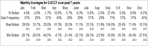 A word of caution: Only 6 years of data is available for shares of GSCCF, perhaps insufficient to create a seasonal profile that accurately gauges the seasonal tendencies influencing the investment. Ideally, while 20 years is preferred, at least 10 years of data is required to perform a seasonal analysis that is considered to be reliable for future seasonal periods.
