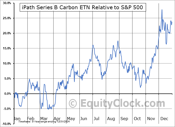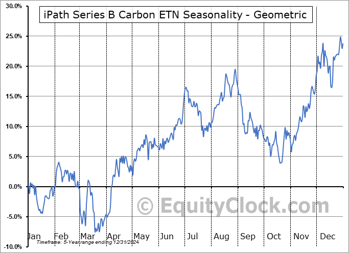 Analysis of the iPath Series B Carbon ETN (AMEX:GRN) seasonal charts above shows that a Buy Date of January 15 and a Sell Date of April 12 has resulted in a geometric average return of 9.74% above the benchmark rate of the S&P 500 Total Return Index over the past 5 years. This seasonal timeframe has shown positive results compared to the benchmark in 5 of those periods. This is an excellent rate of success and the return outperforms the relative buy-and-hold performance of the stock over the past 5 years by an average of 1.94% per year.