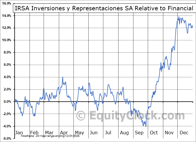 Analysis of the IRSA Inversiones y Representaciones SA (NYSE:IRS) seasonal charts above shows that a Buy Date of September 24 and a Sell Date of January 22 has resulted in a geometric average return of 8.24% above the benchmark rate of the S&P 500 Total Return Index over the past 20 years. This seasonal timeframe has shown positive results compared to the benchmark in 16 of those periods. This is a very good rate of success and the return strongly outperforms the relative buy-and-hold performance of the stock over the past 20 years by an average of 13.75% per year.