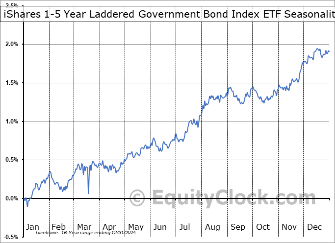 Analysis of the iShares 1-5 Year Laddered Government Bond Index ETF (TSE:CLF.TO) seasonal charts above shows that a Buy Date of July 15 and a Sell Date of October 3 has resulted in a geometric average return of 0.59% above the benchmark rate of the S&P 500 Total Return Index over the past 16 years. This seasonal timeframe has shown positive results compared to the benchmark in 8 of those periods. This is a poor rate of success and the return strongly outperforms the relative buy-and-hold performance of the stock over the past 16 years by an average of 11.37% per year.