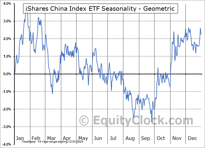 Analysis of the iShares China Index ETF (TSE:XCH.TO) seasonal charts above shows that a Buy Date of August 20 and a Sell Date of November 8 has resulted in a geometric average return of 1.2% above the benchmark rate of the S&P 500 Total Return Index over the past 14 years. This seasonal timeframe has shown positive results compared to the benchmark in 9 of those periods. This is a fair rate of success and the return strongly outperforms the relative buy-and-hold performance of the stock over the past 14 years by an average of 11.36% per year.