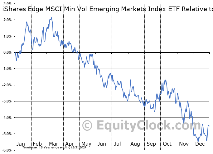 Analysis of the iShares Edge MSCI Min Vol Emerging Markets Index ETF (TSE:XMM.TO) seasonal charts above shows that a Buy Date of December 2 and a Sell Date of March 10 has resulted in a geometric average return of 1.26% above the benchmark rate of the S&P 500 Total Return Index over the past 12 years. This seasonal timeframe has shown positive results compared to the benchmark in 8 of those periods. This is a good rate of success and the return strongly outperforms the relative buy-and-hold performance of the stock over the past 12 years by an average of 9.49% per year.