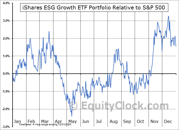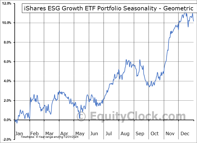 Analysis of the iShares ESG Growth ETF Portfolio (TSE:GGRO.TO) seasonal charts above shows that a Buy Date of July 10 and a Sell Date of September 30 has resulted in a geometric average return of 2.62% above the benchmark rate of the S&P 500 Total Return Index over the past 4 years. This seasonal timeframe has shown positive results compared to the benchmark in 4 of those periods. This is an excellent rate of success and the return strongly outperforms the relative buy-and-hold performance of the stock over the past 4 years by an average of 5.56% per year.
