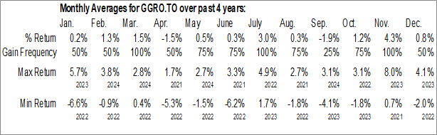 A word of caution: Only 4 years of data is available for shares of GGRO.TO, perhaps insufficient to create a seasonal profile that accurately gauges the seasonal tendencies influencing the investment. Ideally, while 20 years is preferred, at least 10 years of data is required to perform a seasonal analysis that is considered to be reliable for future seasonal periods.