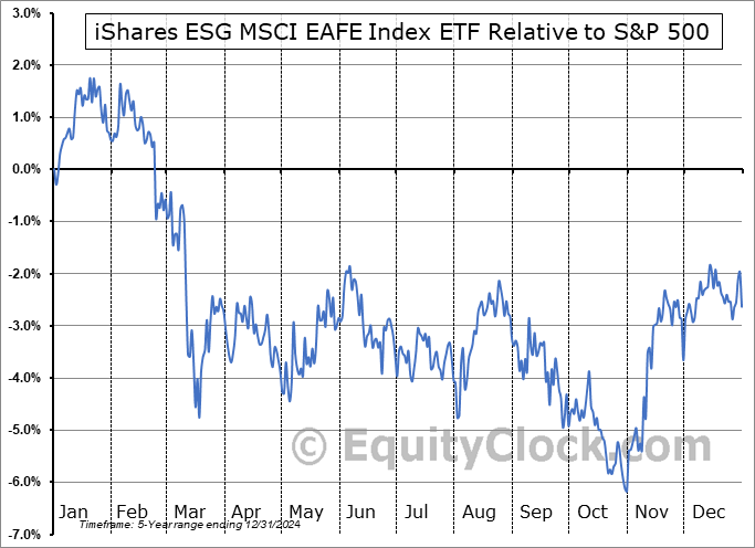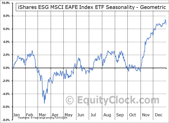 Analysis of the iShares ESG MSCI EAFE Index ETF (TSE:XSEA.TO) seasonal charts above shows that a Buy Date of December 8 and a Sell Date of February 27 has resulted in a geometric average return of 0.52% above the benchmark rate of the S&P 500 Total Return Index over the past 5 years. This seasonal timeframe has shown positive results compared to the benchmark in 4 of those periods. This is a very good rate of success and the return strongly outperforms the relative buy-and-hold performance of the stock over the past 5 years by an average of 7.3% per year.